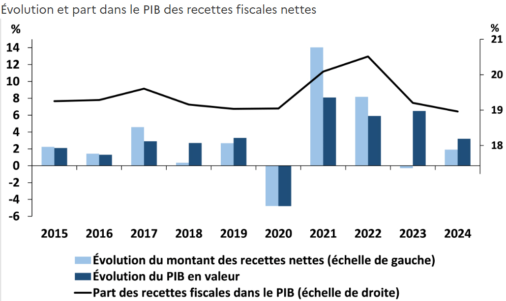 Les recettes fiscales pour l’année 2024 ont été inférieures de 41,5 milliards d’euros aux prévisions, ce qui a contribué au dérapage du déficit public. L’augmentation des taxes sur l’électricité, consécutive à la fin progressive du bouclier tarifaire, et celle de la taxe sur le gaz représentent la moitié de la hausse totale des recettes fiscales. Les impôts sur la consommation y contribuent aussi : leurs recettes fiscales ont augmenté de 10% en un an, la TVA représentant à elle seule 38% de la totalité des recettes fiscales.