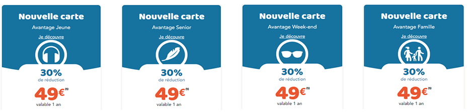 Adieu donc les cartes Enfant+, Jeune, Senior+, Week-end... Ces cartes de réduction actuelles et abonnement Fréquence restent valables jusqu’à la fin de leur validité. Les nouvelles cartes, qui reprennent strictement la même segmentation client se nomment désormais : Avantage Jeune, Avantage Week-end, Avantage Famille et Avantage. Donc véritablement de révolution concernant ces changements de cartes de réduction.
