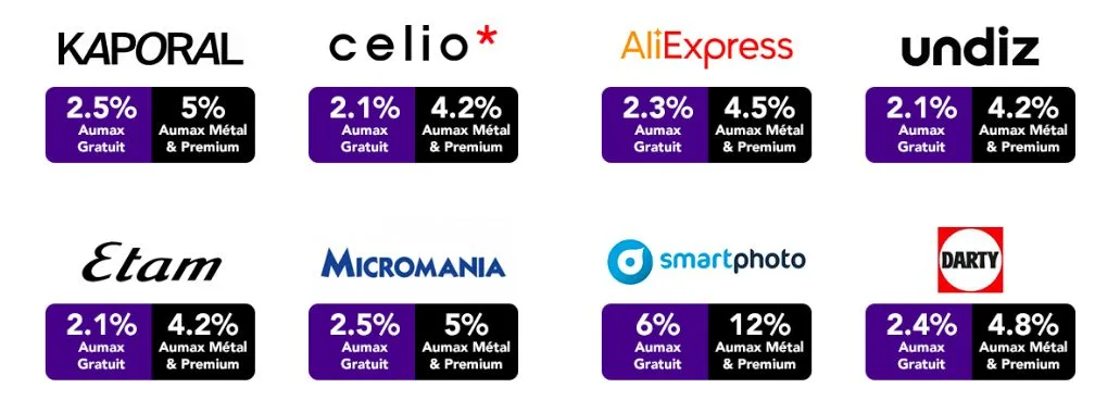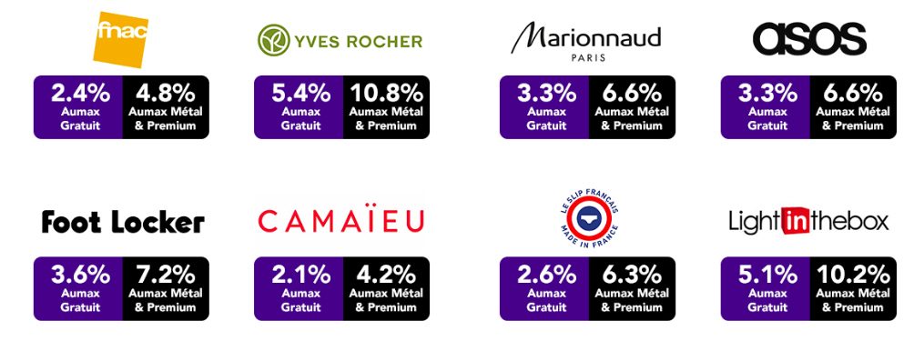 | Enseignes | Cashback Aumax pour moi version gratuite | Cashback avec Aumax Métal & Premium |