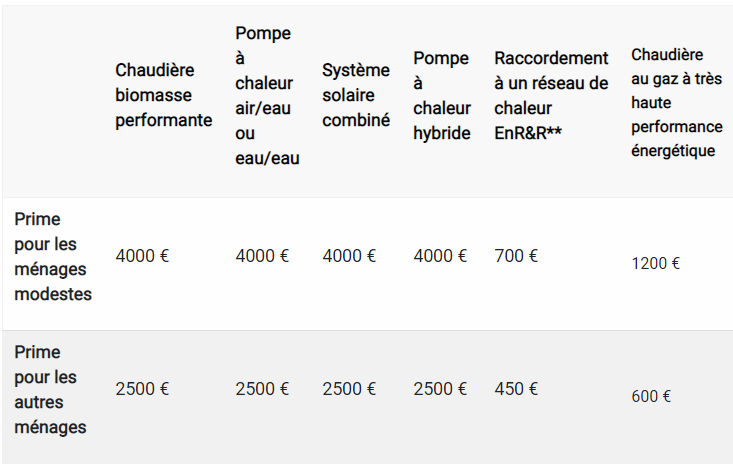 leur chaudière au fioul, au charbon ou au gaz peu performante par un équipement utilisant des énergies renouvelables ou à haute performance énergétique : chaudière biomasse, pompe à chaleur, système solaire combiné, chaudière au gaz à très haute performance énergétique, appareil de chauffage au bois très performant, raccordement à un réseau de chaleur ;
