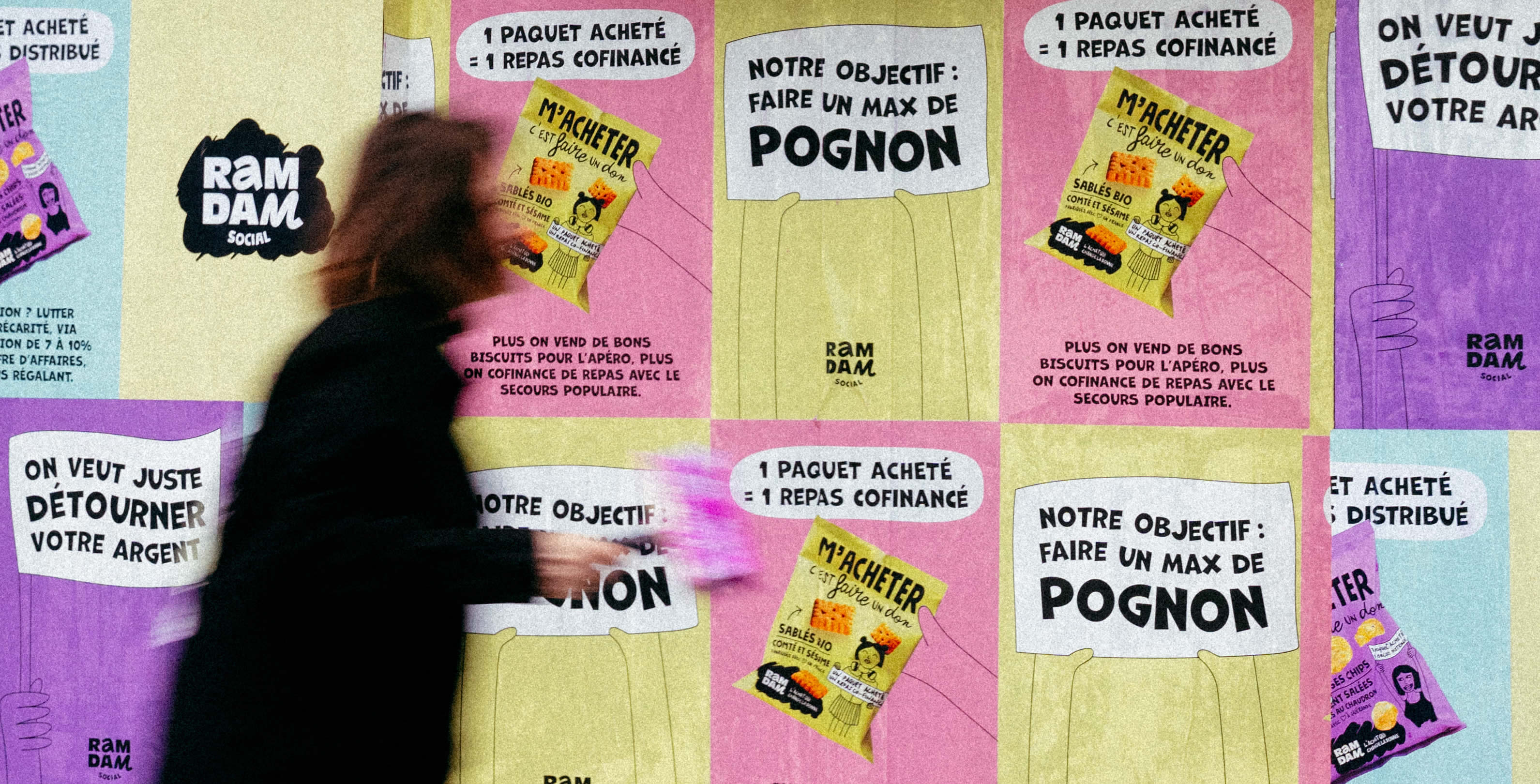Ramdam social, jeune start-up à impact, lance une opération coup de poing à travers des affiches aux messages provocateurs, collées sur les vitrines de magasins Franprix parisiens (chez qui la marque est distribuée depuis le 15/04). Les messages accrocheurs : "On veut faire un max de pognon" et "On va détourner votre argent", veulent créer la curiosité chez le consommateur et l’inviter à acheter solidaire.