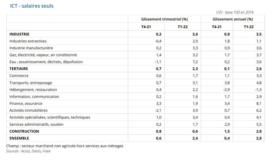 Ainsi, au premier trimestre 2022, l’indice du coût du travail (ICT) – salaires seuls de l’ensemble du secteur marchand non agricole (hors services aux ménages) augmente de 2,4 % en glissement trimestriel, après une hausse de +0,6 % le trimestre précédent (en données corrigées des variations saisonnières et des jours ouvrables). Sur un an, l’ICT – salaires seuls accélère nettement : +2,8 % par rapport au premier trimestre 2021, après +0,4 % le trimestre précédent.