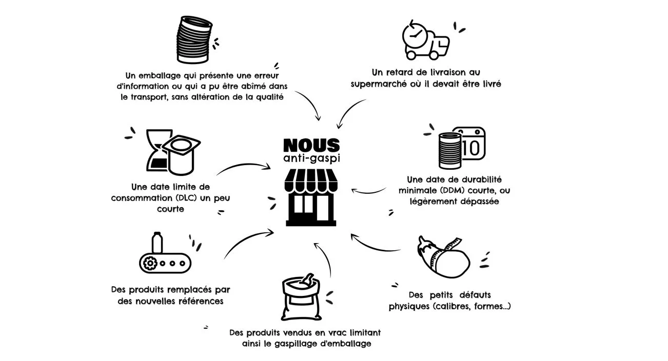 Acteur unique de l’anti-gaspillage alimentaire, NOUS anti-gaspi sauve des denrées en amont des circuits classiques de distribution. Le réseau de 24 épiceries achète quotidiennement des denrées déclassées, mal ou pas du tout valorisées jusque-là : petits défauts physiques sur les fruits et légumes, produits dont la date de durabilité minimale est proche, voire dépassée, remplacement par de nouvelles références... Pour ensuite les revendre dans ses rayons à des prix défiant toute concurrence.