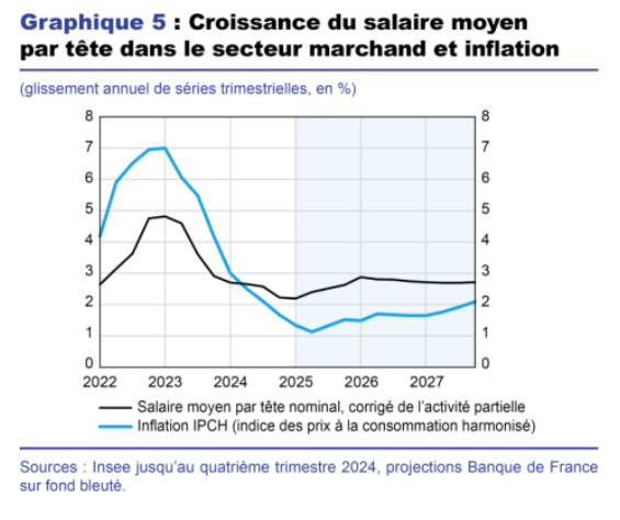 Le salaire moyen par tête continue d’augmenter plus rapidement que les prix depuis le deuxième trimestre 2024, une tendance qui se poursuivrait sur tout l’horizon de prévision. Par rapport aux projections de décembre 2024, les dernières informations disponibles sur les salaires négociés dans les branches et les entreprises (qui prévoient pour 2025 des hausses voisines de 2 % en moyenne pour le salaire de base, c’est-à-dire hors effets de composition et primes) conduisent à réviser la croissance en moyenne annuelle du salaire moyen par tête en 2025 de – 0,4 point, à +2,4 %.