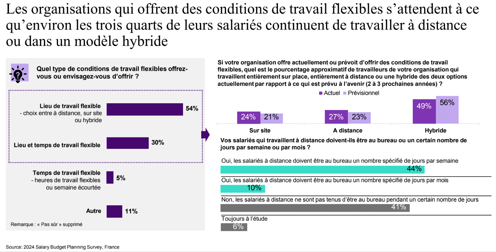 Plus de 8 organisations sur 10 (84%) offrent des conditions de travail flexibles, avec la majorité de leurs salariés choisissant le modèle hybride ou 100% en distanciel (76%), contre un quart le présentiel (24%).