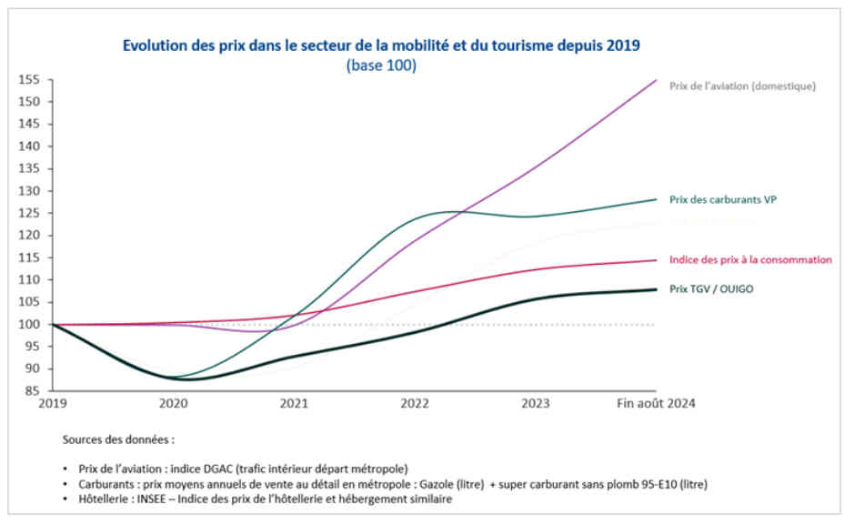 La progression du prix moyen du billet grande vitesse, entre 2023 et 2024, a été de l’ordre de 2%. En comparaison avec 2019, la progression du prix moyen pour un billet grande vitesse est inférieure à 8%, à comparer avec une évolution de l’ordre de 18% de l’indice des prix (inflation générale).