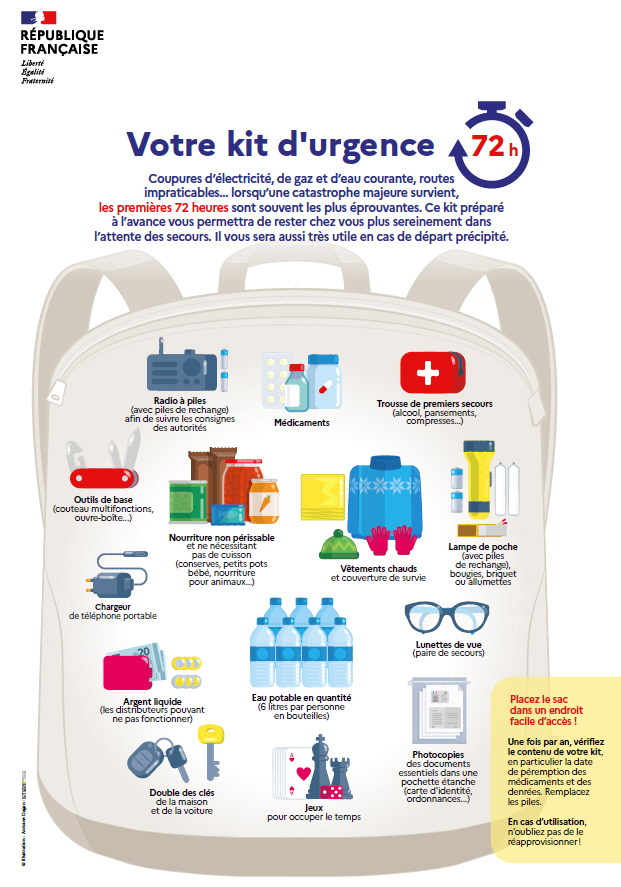 Le gouvernement français a communiqué une liste complète pour vous constituer votre kit d’urgence :