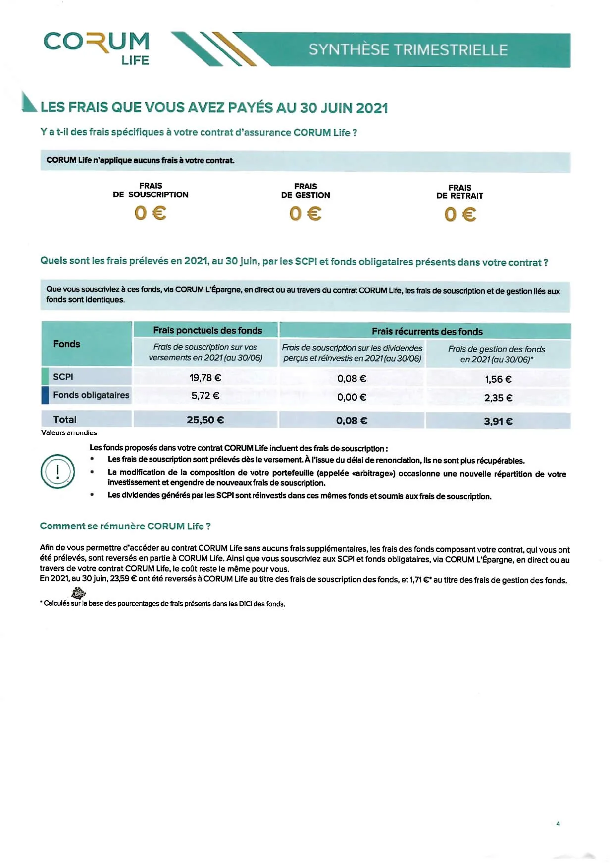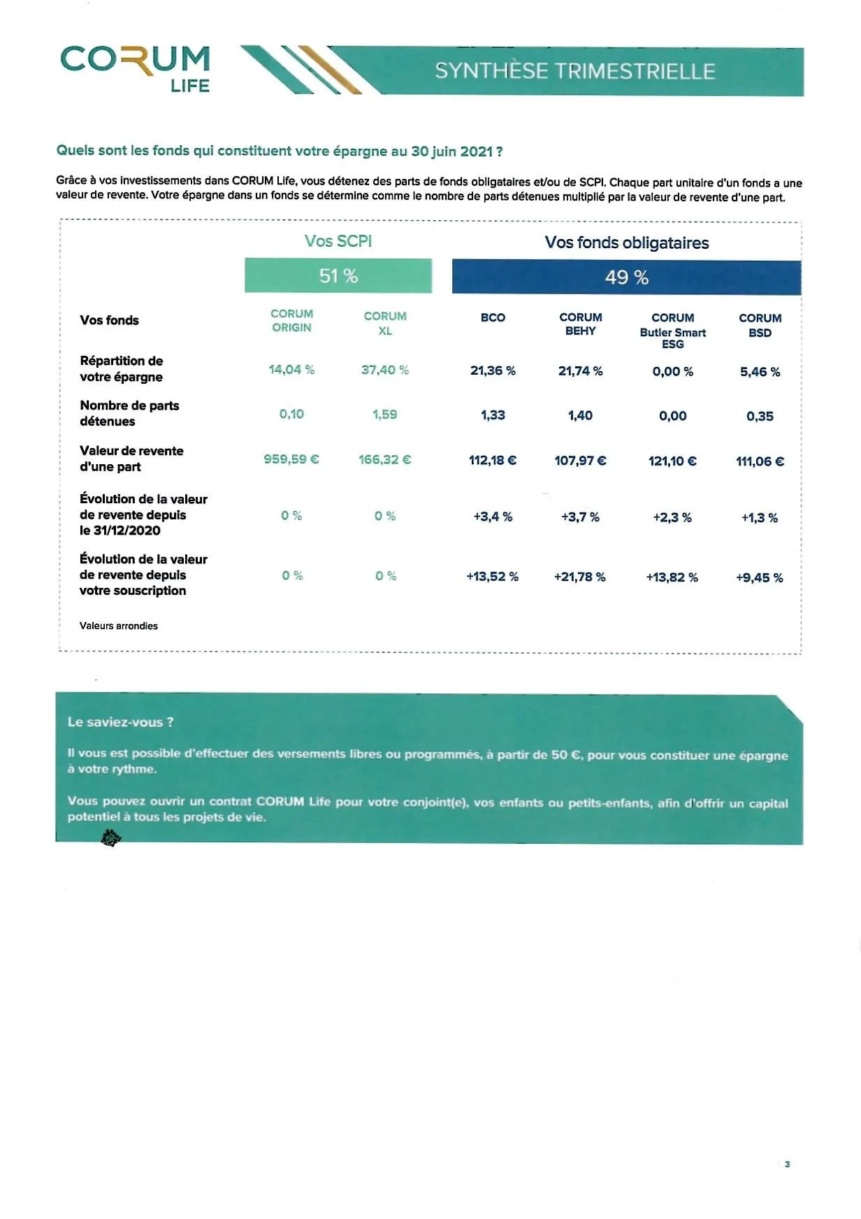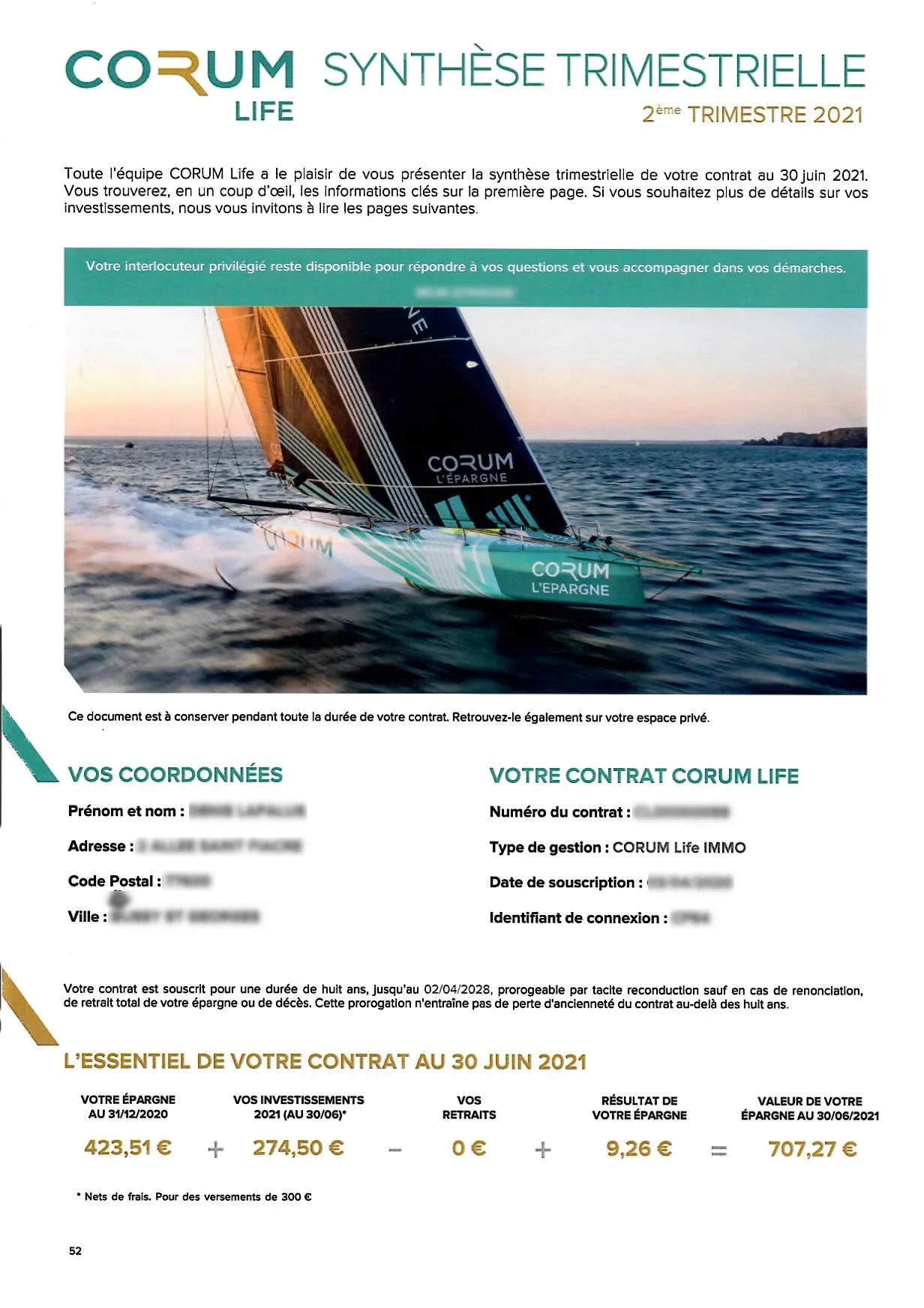 Chaque année, l’assureur est tenu d’adresser à chacun de ses assurés au minimum un relevé de leur contrat d’assurance-vie. Le nouvel assureur du marché CORUM Life bouscule les lignes et adresse, tous les trimestres, une synthèse complète, claire et pertinente, probablement la meilleure synthèse du marché. Un point positif supplémentaire appréciable pour les épargnants.