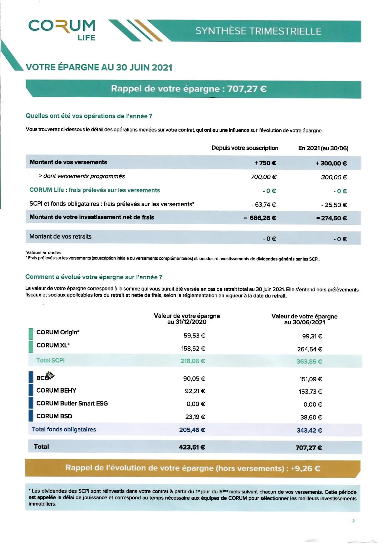 Évidemment, ce contrat CORUM Life ne propose pas 650 unités de compte, avec de multiples supports financiers de différentes natures. Il est donc effectivement davantage aisé d’apparaître comme lisible un relevé ne traitant que 6 unités de compte. Toutefois, si certains assureurs pouvaient prendre exemple sur les synthèses de CORUM Life, je connais nombre d’épargnants qui seraient ravis. Toute considération des qualités intrinsèques des différents contrats d’assurance-vie par ailleurs, il s’agit là d’évoquer la qualité du reporting et non des placements financiers.