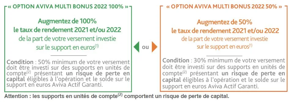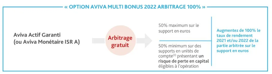 Les sommes investies sur le support Aviva Actif Garanti au titre des versements/arbitrages effectués dans le cadre de l’opération Aviva Multi Bonus 2021 toujours investies au 31 décembre 2021 et/ou au 31 décembre 2022 et aux dates d’attribution effective de la participation aux bénéfices pourront bénéficier d’un complément de rémunération de 50% pour les versements, ou 100% pour les versements et arbitrages, du taux de rendement global du support Aviva Actif Garanti, sous réserve qu’une part minimum du versement ou de l’arbitrage (fixée à 30% ou 50% selon l’option choisie) soit affectée aux supports en unités de compte éligibles à l’opération et le demeure jusqu’au 31 décembre 2021 et/ou au 31 décembre 2022. Le détail des conditions de l’offre est précisé dans l’annexe contractuelle. Le montant cumulé des versements/arbitrages effectués dans le cadre de l’opération Aviva Multi Bonus 2022 est au maximum de 500 000 € pour une même adhésion.