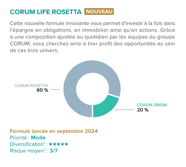 Dans sa brochure, CORUM L’Epargne indique : "La formule mixte CORUM Life Rosetta vous permet à la fois de tirer profit des univers en obligations, en immobilier et désormais en actions ! Grâce au savoir-faire du groupe CORUM, la composition est ajustée pour saisir les opportunités. L’objectif est d’investir votre épargne au bon endroit, au bon moment, pour chercher à bénéficier des opportunités. La diversification et la flexibilité de ce placement innovant offrent un autre avantage : la possibilité de viser une bonne gestion du risque."