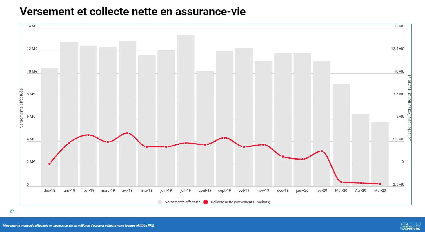 Pour le mois de mai 2020, la collecte nette s’établit à - 2,2 milliards d’euros. Le montant des prestations versées en mai s’élève à 7,9 milliards d’euros, alors que les cotisations versées s’élèvent à 5,7 milliards d’euros. A l’image des mois de mars et d’avril, le mois de mai est marqué par une collecte nette négative. Le contexte atypique (confinement jusqu’à la mi-mai, puis déconfinement progressif) a restreint le nombre d’opérations et les placements en Assurance Vie.
