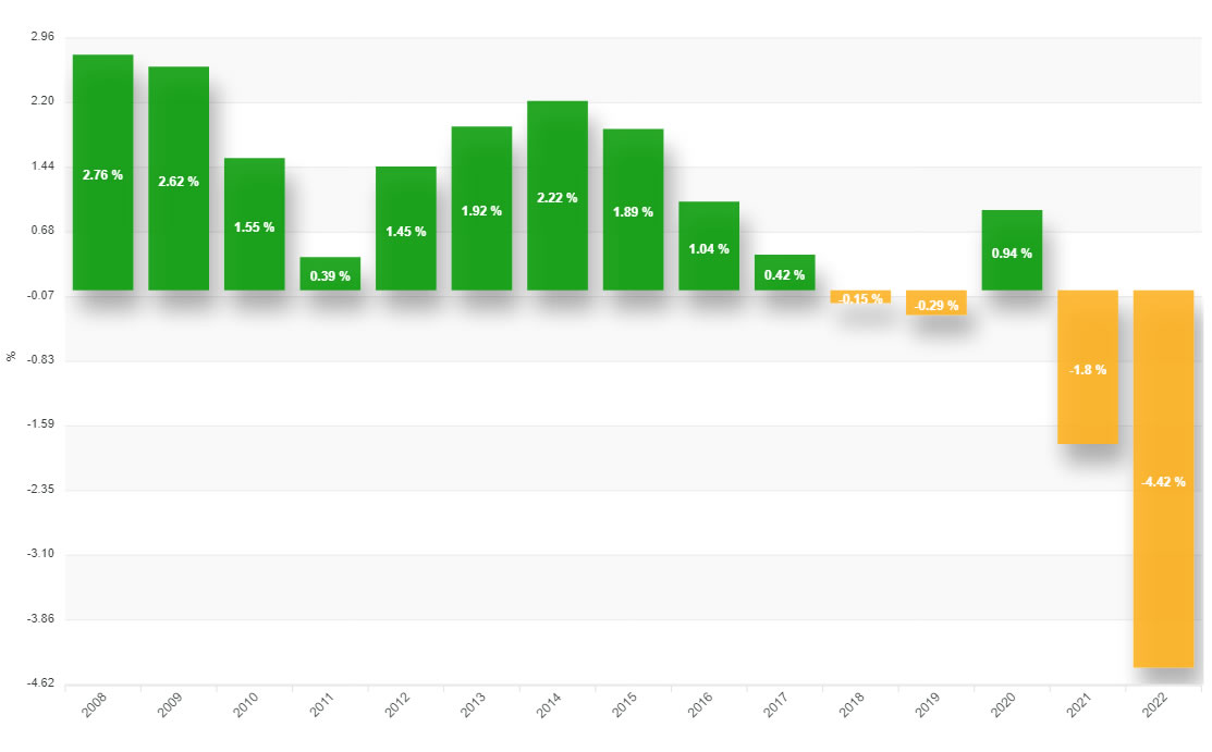 Si le montant global des versements effectués en Assurance-Vie n’est pas un record, la proportion des versements en unités de compte a battu un nouveau record en atteignant 40% des versements effectués. De son côté les fonds eruos faisaient, comme attendu, leur grand retour, avec un rendement moyen de 2% (net des frais de gestion, brut des prélèvements sociaux et fiscaux). Malheureusement pour les épargnants, l’année boursière 2022 a été compliquée, les marchés obligataires et actions étant tous les deux orientés à la baisse. De son côté, le marché immobilier, et notamment celui des SCPI et des SCI, via l’assurance-vie, a permis de limiter les dégâts concernant les pertes latentes sur cette partie de capital investie en unités de compte.