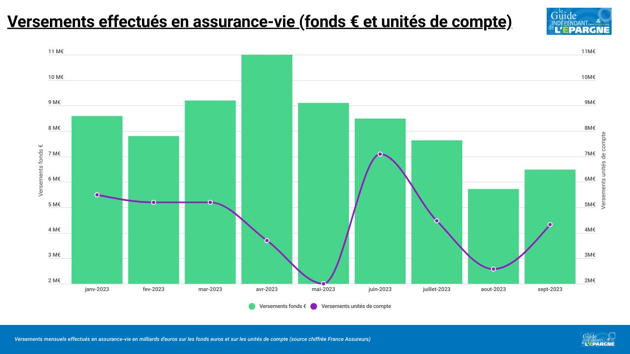 Après un mois d’août en forte baisse des versements, les épargnants ont davantage versé en septembre sur leurs contrats d’Assurance-Vie, d’après les chiffres publiés par France Assureurs fin octobre. En repassant au-dessus du seuil des 10 milliards d’euros, l’assurance-vie, reste, de très loin, le placement épargne préféré des Français. Au mois de septembre, les épargnants ont versé 10,8 milliards d’euros en assurance-vie. Le montant total versé en septembre sur les fonds euros est de 6,48 milliards contre 4,32 milliards pour les unités de compte.