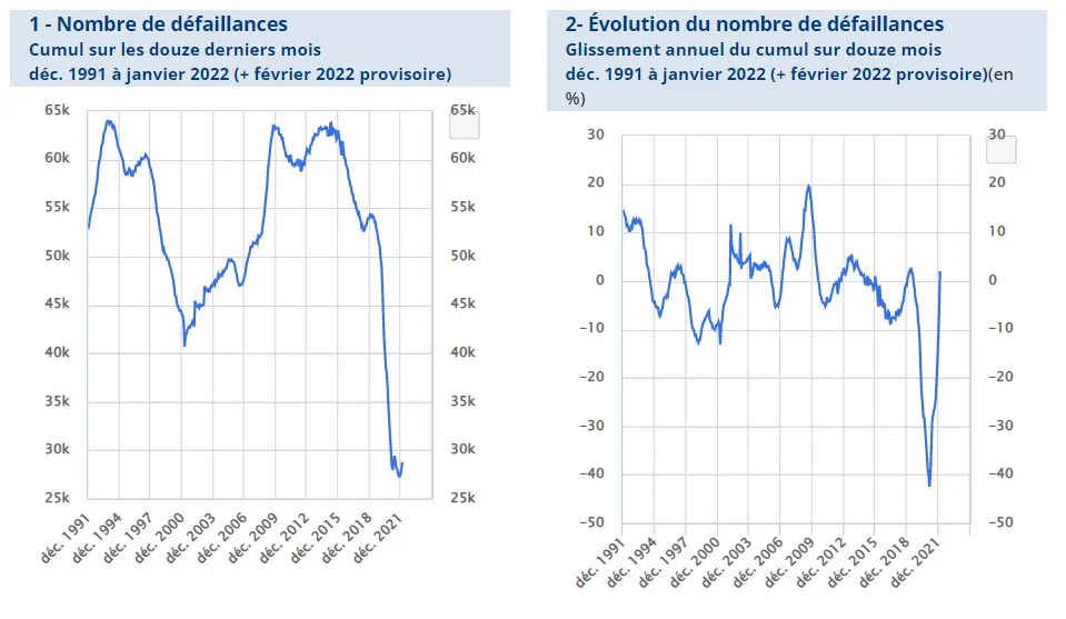 Selon les chiffres officiels publiés par la Banque de France, à fin février 2022, le nombre de défaillances cumulé sur un an (entre mars 2021 et février 2022) s’élève à 28 765. Ce chiffre marque une légère augmentation du nombre de défaillances de 2,0 % par rapport à celui enregistré entre mars 2020 et février 2021.