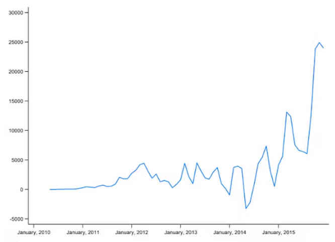 La figure 2 présente l’évolution de la différence du nombre total de contributions entre les deux plates-formes. On y constate nettement que l’écart se creuse entre Ulule et KKBB.
