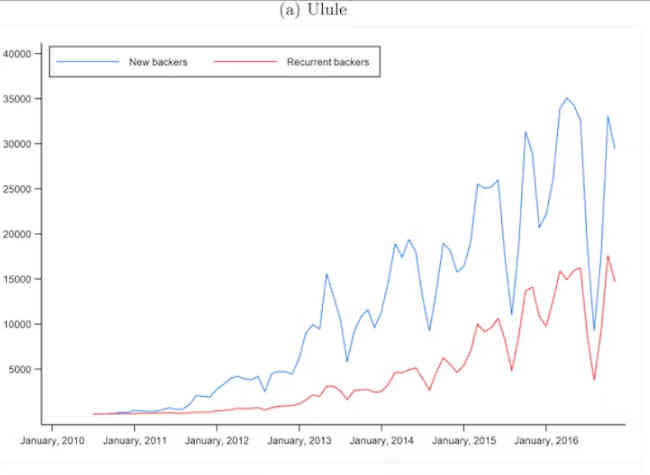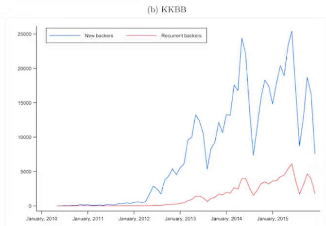 Ensemble, les deux figures suggèrent que les contributeurs récurrents expliquent en partie les trajectoires de croissance divergentes d’Ulule et de KKBB.