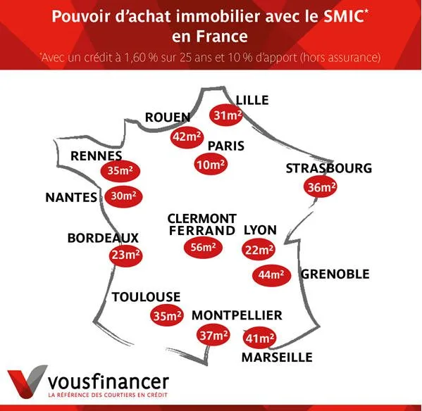 Vousfinancer, réseau de courtiers en crédit immobilier a souhaité connaitre la surface qu’il est possible d’acheter dans 13 villes de France avec le salaire minimum (pour une mensualité égale à 33 % du smic, en remboursant un crédit sur 25 ans à 1,60 % avec 10 % d’apport pour financer les divers frais).
