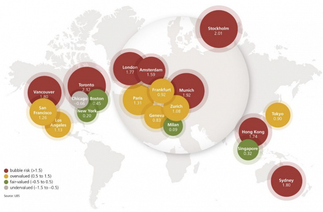 Même New-York n’est pas considérée comme étant en phase de bulle immobilière par UBS. C’est au Canada que les prix se sont le plus envolés, par rapport à la hausse des revenus de la population. Ainsi Toronto et Vancouver sont des bulles immobilières à haut risque, marquant néanmoins le dynamisme de l’économie canadienne.