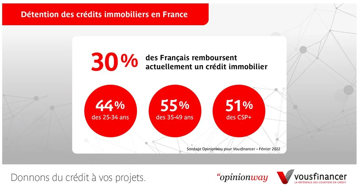Au total, 30 % des Français ont actuellement un crédit immobilier en cours. Un chiffre en légère hausse par rapport à l’édition 2021 (+ 2 points) et en forte augmentation chez les moins de 35 ans (44 % ont un crédit en cours, + 14 points en 1 an), les CSP + (51 %, + 8 points) et les 35 à 49 ans (55 % + 3 points).