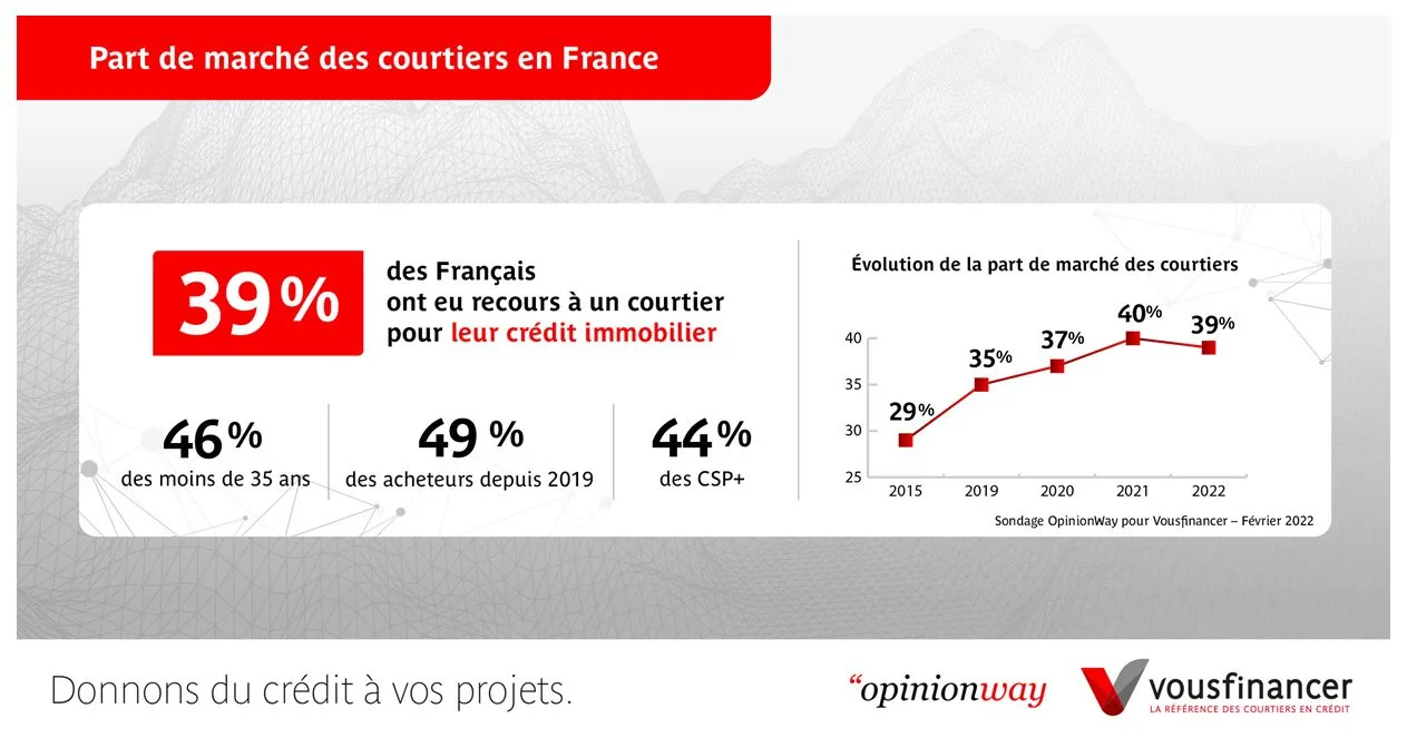 Parmi les Français possédant un crédit immobilier, 39 % ont fait appel à un courtier, contre 40 % début 2021, après une année 2020 marquée par le durcissement des conditions d’octroi des banques et le covid. Ce chiffre reste supérieur d’il y a deux ans (37 %) et bien au-delà du niveau de 2015 (29 %, + 10 points).