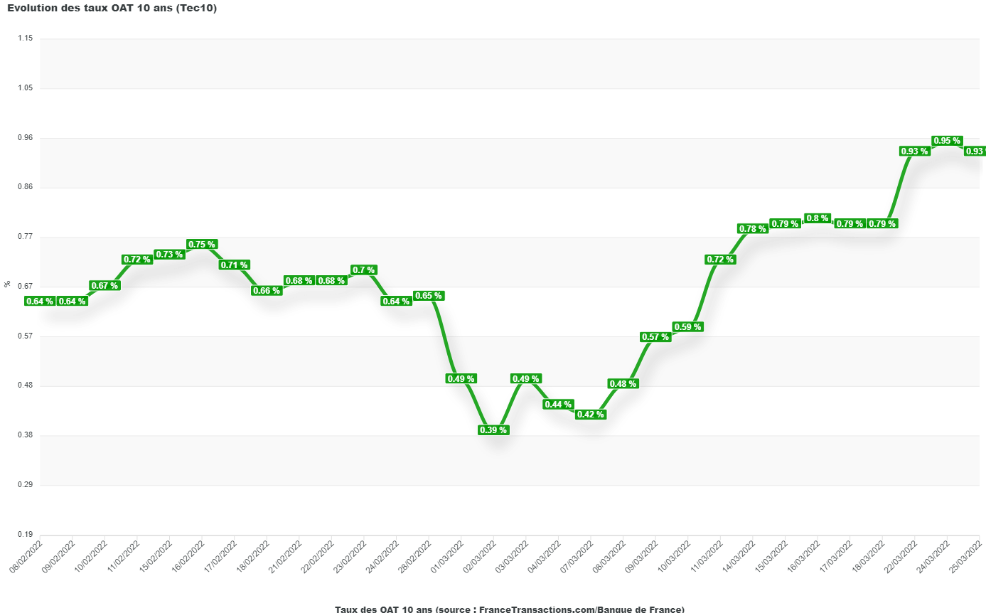 Bien que n’ayant aucun lien direct avec les taux d’intérêt des crédits immobiliers proposés aux particuliers, scruter le taux des OAT permet d’estimer la tendance. Clairement sur la fin mars, la hausse des taux est forte. En Europe, et notamment en Allemagne, la remontée des taux d’intérêt est encore plus forte, ne laissant que peu d’espoir sur une accalmie dans les semaines à venir.