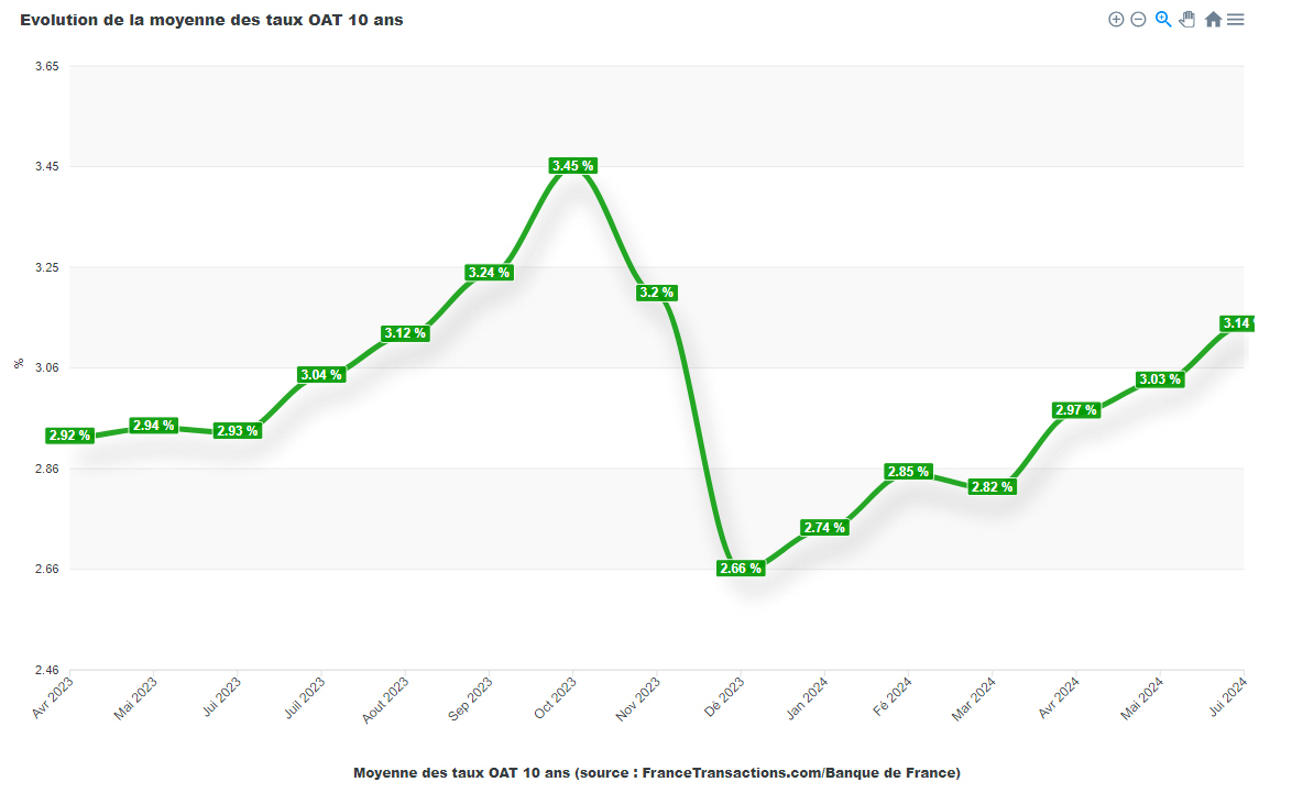Les taux d’intérêts de marché en France continuent leur ascension entamée depuis le début de l’année 2024. La relative faiblesse de l’économie, et la chute des indicateurs avancés (services notamment) ne plaident pas en la faveur d’un retour de la baisse dans les mois à venir. Les économies sont entrées dans un mode de ralentissement de l’activité. Les incertitudes politiques restent anecdotiques à côté du déficit budgétaire tricolore. Le paiement de la dette devenant un sujet de plus en plus important avec la remontée des taux d’intérêt. La moyenne mensuelle des taux des oat est clairement orientée à la hausse.