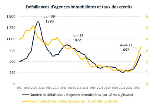Les importantes difficultés du marché de la transaction se répercutent sur la santé des acteurs économiques que sont les agences immobilières. En effet, une baisse moyenne de 20% du nombre de ventes et de 4% des prix en 2023 pourrait entraîner une baisse de chiffre d’affaires en transaction d’environ 24% (sans compter un éventuel impact du contexte concurrentiel entre négociateurs). Le nombre de défaillances dans le secteur a ainsi doublé en un an, à 657 défaillances sur les 12 derniers mois à fin août 2023. En comparant leurs évolutions historiques, on constate que les défaillances d’agences immobilières sont très corrélées à l’évolution des taux d’intérêt. Avec le risque d’une poursuite de l’augmentation des taux, le seuil des 1000 défaillances sur 12 mois devrait donc être franchi au cours de l’année 2024.