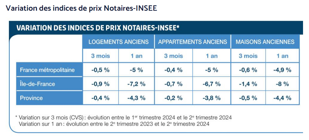 Du côté des notaires, le ton est à l’optimisme relatif. Le volume de transactions de logements anciens en cumul sur les douze derniers mois en France (hors Mayotte) atteint 780000 transactions à fin août 2024. La baisse annuelle est désormais de 18,1 % et, pour le deuxième mois consécutif, sous les 20 %. Les ventes représentent 2,1 % du stock de logements, une part en baisse depuis le point haut du 3e trimestre 2021 (3,2 %) et désormais inférieure au niveau du début des années 2000, avant la crise économique de 2008. Au rythme actuel et prenant en compte que la baisse ralentit, l’année devrait se terminer au-dessus des 700000 transactions, ce qui reste un point bas jamais atteint depuis mai 2015.