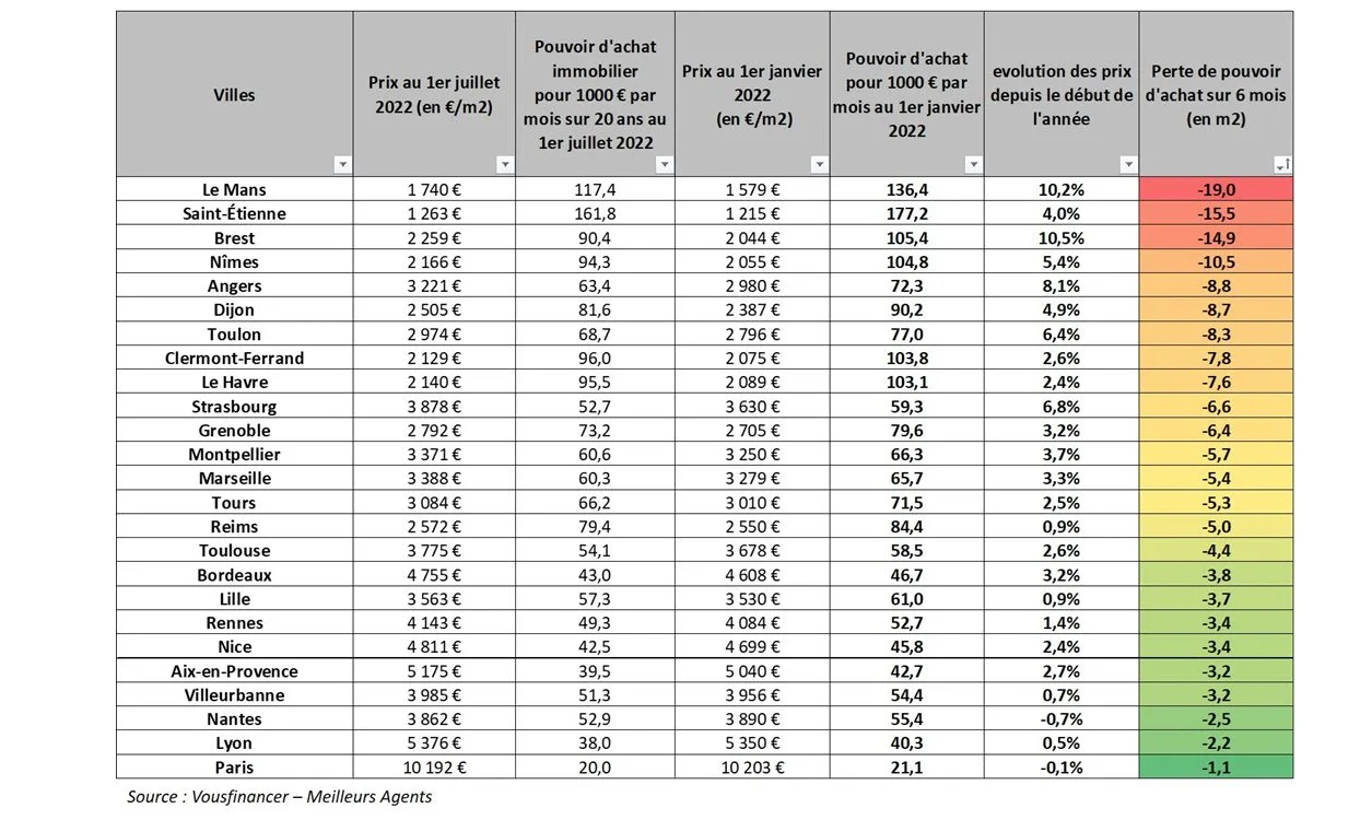 Ainsi, en seulement 6 mois, sous l’effet combiné des taux et des prix, la perte de pouvoir d’achat (pour 1000 € par mois sur 20 ans avec 10 % d’apport) atteint 19 m2 au Mans - l’équivalent de presque 2 chambres -, 15,5 m2 à Saint-Etienne, 14,9 m2 à Brest et 10,5 m2 à Nîmes. Le recul est compris entre 6 et 8 m2 à Grenoble, Strasbourg, Le Havre, Clermont-Ferrand, Toulon, Dijon et Angers et atteint globalement plus de 5 m2 dans 15 villes sur 25 !