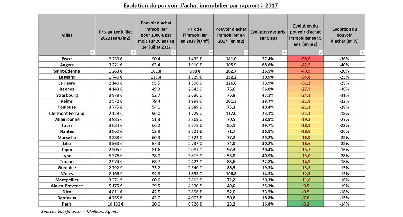 Principale explication : en 5 ans, dans certaines villes de France, les prix ont augmenté de plus de 40 %. C’est le cas à Lyon (40,9 %), Toulouse (40,4%, Strasbourg (47,1 %), Rennes (56,8%), avec des records atteints à Brest (+ 57,4 %) et Angers (68,6 %), ville qui affiche en valeur relative, la plus forte baisse de pouvoir d’achat (- 40 % en 5 ans).