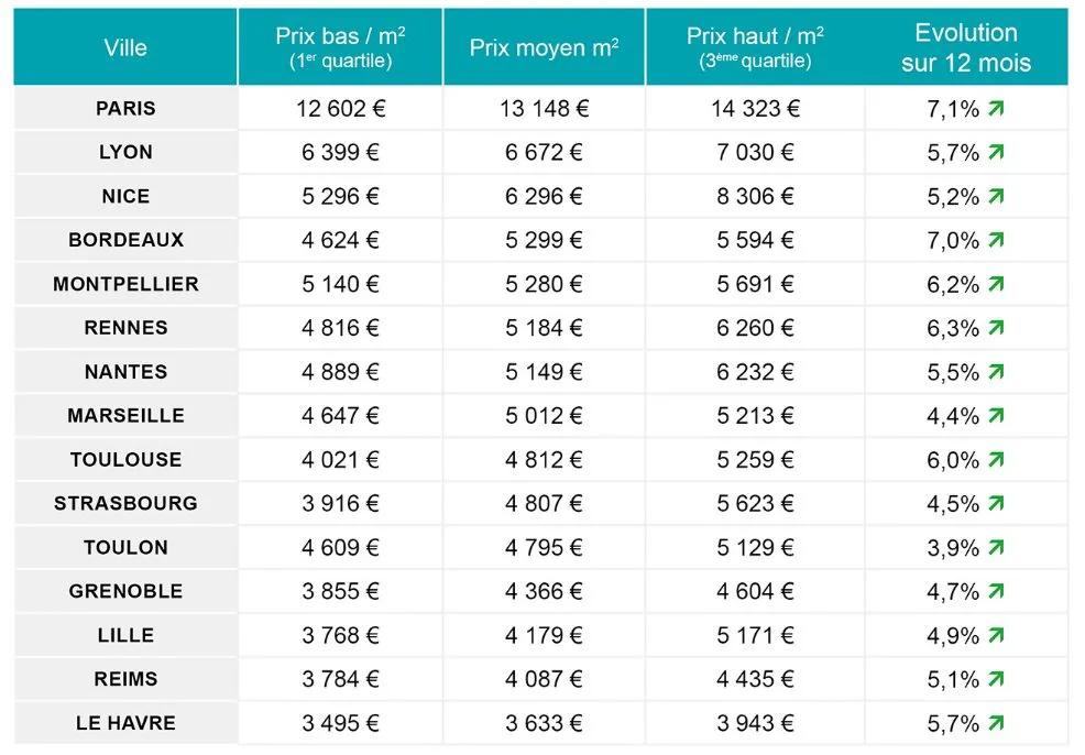 Paris tire son épingle du jeu dans ce classement avec la plus forte progression du TOP 15 (+7,1 %) et un prix moyen qui frôle les 13 150 €/m². Avec Paris, Lyon et Nice complètent toujours le même trio des villes à plus de 6 000 €/m², avec respectivement 6 672 €/m² et 6 296 €/m². Après plusieurs mois de hausse maîtrisée, Bordeaux affiche l’une des plus fortes progressions du TOP 15 (+7,0 %) et repasse en 4ème position, juste devant Montpellier (5 280 €/m²).