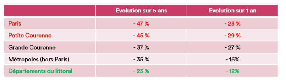 La baisse des recherches d’achat n’a pas du tout la même ampleur selon les marchés, traduisant une évolution de l’attractivité des différents territoires :