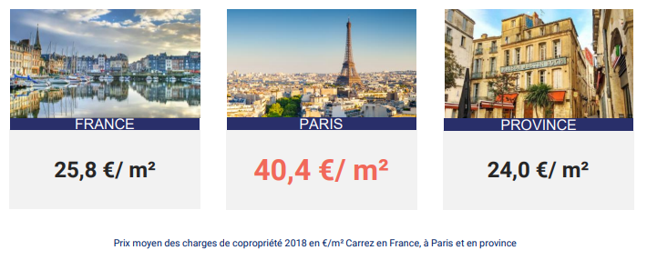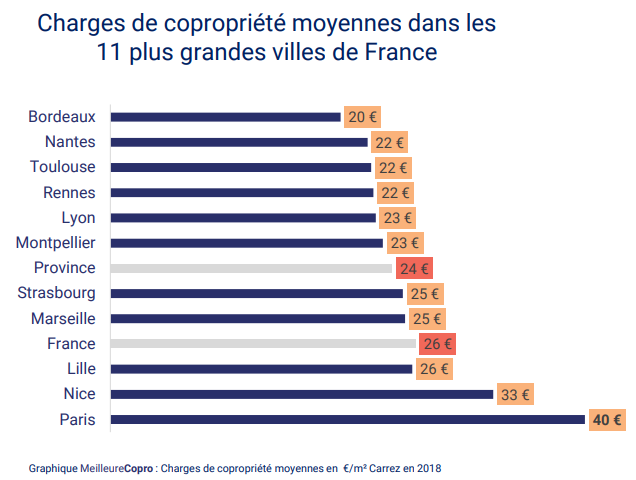 Le prix moyen des charges de copropriété en 2018 (en €/m² Carrez/an) montre que la capitale bat un record en affichant une moyenne à 40,4 € / m², à comparer avec le niveau observé dans les métropoles régionales : 24,0 € / m². La moyenne nationale se situe, quant à elle, à 25,8 € / m².