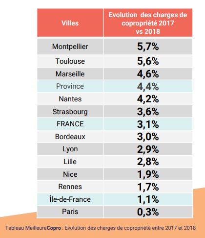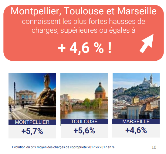 Dans le détail des grandes agglomérations, la palme de la ville où les charges, en valeur absolue, sont les plus chères (hors Paris) revient à Nice (32,6 € /m²/an), suivie de Lille (25,7 €). La moyenne annuelle des charges de copropriété est de 25,1 € à Marseille, 24,9 € à Strasbourg, 23,2 € à Montpellier, 22,6 € à Lyon, 22,4 € à Rennes, 22,2 € à Toulouse, 21,9 € à Nantes et de 19,6 € à Bordeaux.