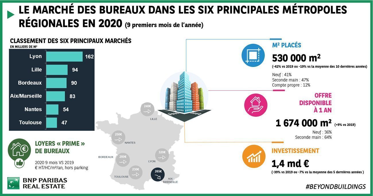 La demande exprimée auprès de BNP Paribas Real Estate par les utilisateurs pour des bureaux en régions est en baisse de 20% durant les neuf premiers mois de l’année 2020, par rapport à la même période de l’année 2019. « Il est à noter que la demande pour des surfaces importantes (> 2 000 m²) ne diminue que de 14%, ce qui laisse des raisons d’être optimiste pour 2021. » ajoute Jean-Laurent de La Prade.