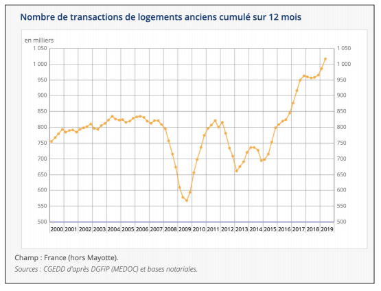 Le nombre de transactions de logements anciens, qui était déjà à un niveau élevé, est en forte hausse. Il bat un nouveau record en franchissant la barre historique du million de logements (1 017 000) à fin juin 2019 en cumulé sur les 12 derniers mois, contre 985 000 à fin mars et 965 000 à fin décembre 2018, d’après le ministère. Ce nombre très élevé de transactions est toutefois à relativiser. Le taux de rotation du parc (qui prend en compte l’agrandissement progressif du parc) n’est pas très supérieur à celui du début des années 2000.