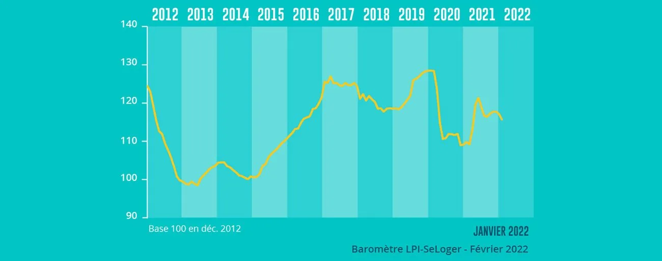 Et en janvier 2022, alors que les dispositions du HCSF sont devenues contraignantes, les ventes reculent de 5.7 %. Elles se situent donc en retrait de 14.3 % par rapport à janvier 2021. Le ralentissement du marché qui se renforce depuis l’été 2021 commence donc à peser fortement sur le dynamisme du marché qui avait prévalu l’année passée, car les achats des particuliers sont devenus moins faciles à financer : non pas en raison de la hausse des prix de l’ancien, mais parce que les apports personnels exigés par les banques sont à des niveaux tels qu’une large partie de la demande potentielle est maintenant exclue du marché.