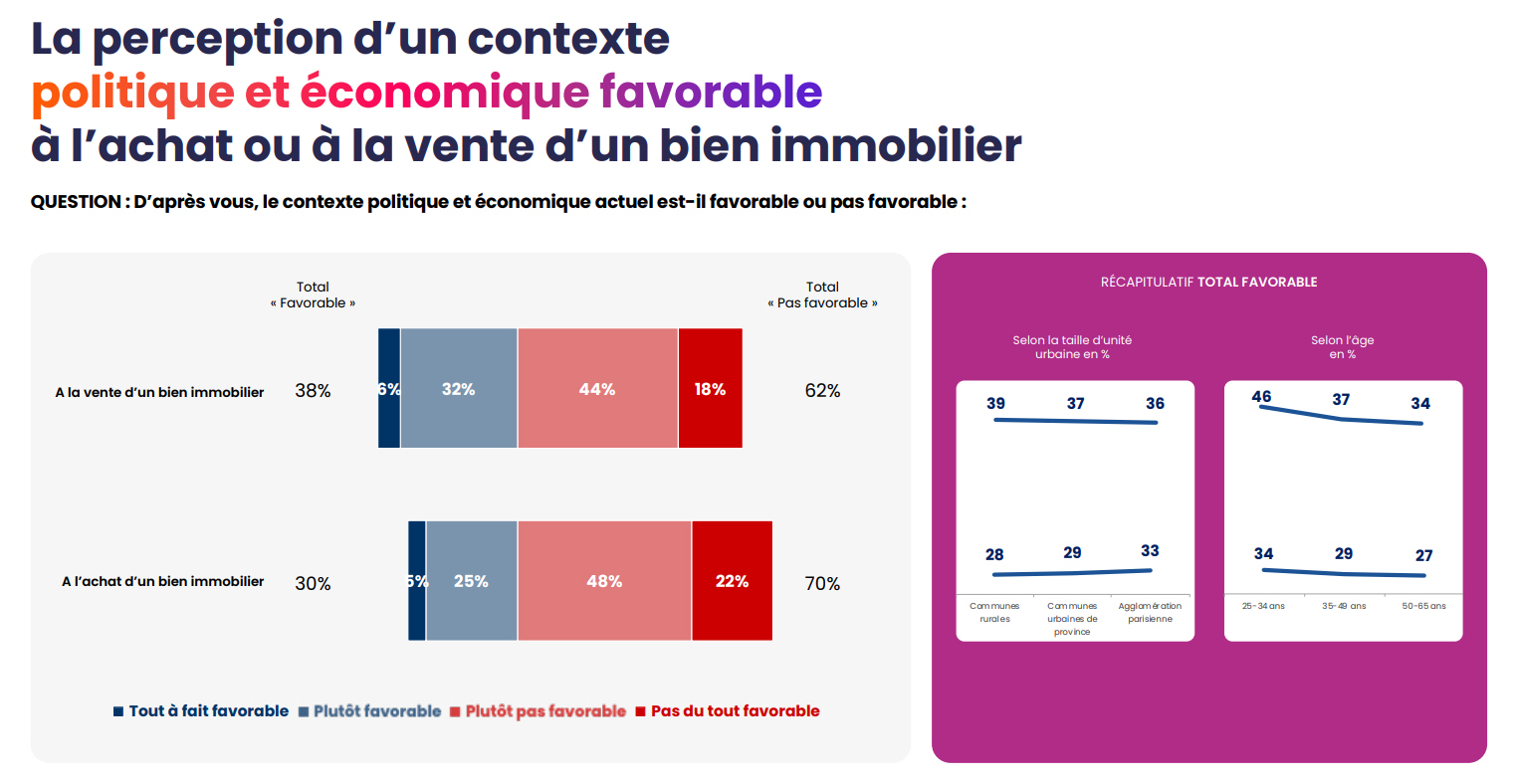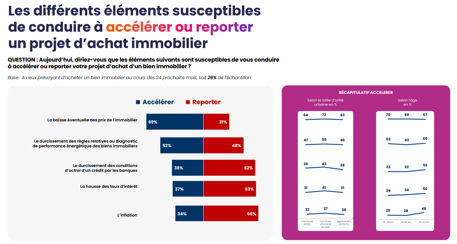 Le contexte économique et politique actuel n’est pas favorable à l’achat immobilier estiment 70 % des sondés. Ils sont même 22 % à déclarer qu’il ne l’est « pas du tout ». En même temps, si les prix baissaient, 69 % déclarent être prêts à accélérer leur projet d’achat.