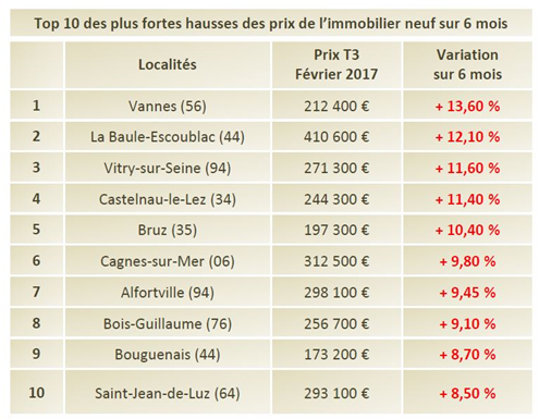 A l’inverse, des localités qui avaient enregistré de fortes baisses l’an dernier, voient le prix moyen d’un trois-pièces beaucoup progresser depuis 6 mois. Exemple : Vannes dans le Morbihan : après -* 8 % en juin 2016 sur 6 mois, devient la ville avec la plus forte augmentation : + 13.6 % depuis août 2016, soit un trois-pièces à 212 400 € et 25 000 € de plus qu’il y a 6 mois.