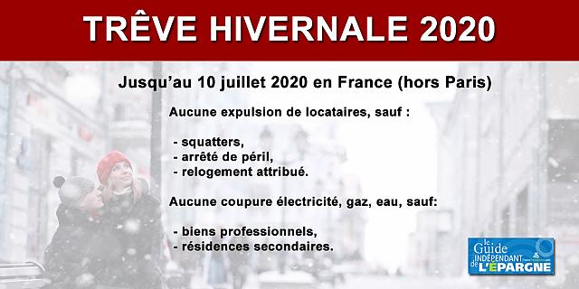 Aucune expulsion locative ne peut avoir lieu durant la période dite de trêve hivernale, allant du 1er novembre au 31 mars de l’année suivante. Mais pour l’année 2020, compte-tenu des impacts de la pandémie COVID, la fin de la trêve hivernale est repoussée au 10 juillet 2020 inclus (date de fin de l’état d’urgence sanitaire, à ce jour).