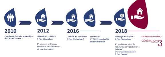 Ainsi, dans son bulletin trimestriel le gestionnaire de l’OPCI Silver Génération, A Plus Finance, indique : "L’OPCI (Organisme de Placement Collectif dans l’Immobilier) sera composé, à l’issu d’une période de 3 ans à compter de sa création, de 60 à 70% d’actifs immobiliers dont une majorité ayant la destination de Résidences Services pour Seniors, RSS, non médicalisées (accompagnés de biens meubles qui leurs sont affectés et qui sont nécessaires à leur usage ou leur exploitation) et de 25% en produits financiers, dont la moitié au maximum en Fonds actions et 5% en liquidité. L’OPCI a pour objectif de proposer à ses souscripteurs une revalorisation de la valeur des Parts souscrites ainsi qu’une distribution régulière de revenus.