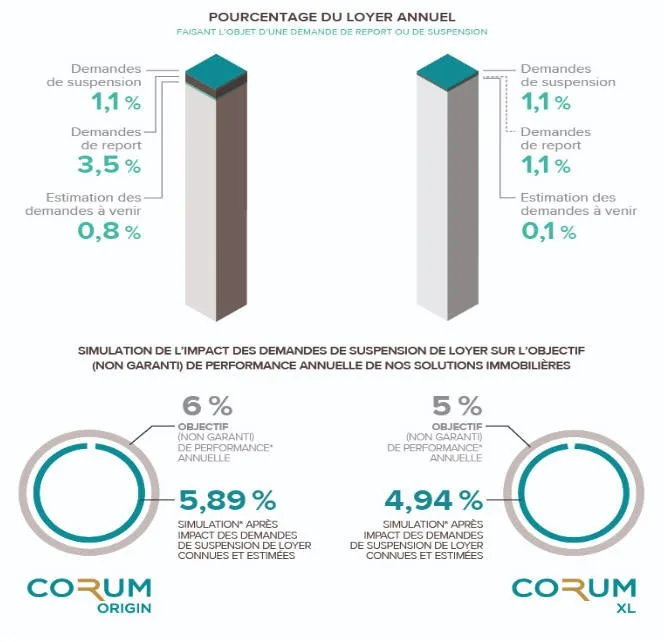 Si les interrogations, suite à la cette crise économique de 2020, sont légitimes concernant l’évolution du marché de l’immobilier, CORUM AM communique régulièrement afin d’informer les investisseurs de la situation. Ainsi le dernier point CORUM du 26 mai, publié sur le site CORUM indique : "Nous accompagnons les locataires les plus touchés en différant le paiement de leurs loyers. Ainsi, cela leur permettra de traverser cette situation difficile et d’être en mesure de redémarrer leur activité le plus tôt possible. Environ un tiers de nos locataires nous a contactés depuis le début du confinement. Le flux de demandes que nous recevons est à présent en baisse, signe d’une relative stabilisation de la situation. Nous continuons de dialoguer au quotidien avec nos locataires et restons vigilants afin de ne pas subir les comportements de ceux qui chercheraient à profiter de la situation. Nous restons transparents sur l’impact de cette mesure. En date du 26 mai, les demandes reçues de la part de nos locataires auraient l’impact décrit ci-contre sur le total des loyers de l’année 2020. Nous mettons ce chiffre à jour chaque semaine."