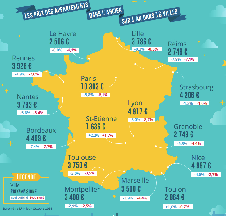 Selon le dernier baromètre septembre 2024, publié par LPI IAD, les prix de l’immobilier sur une année glissante sont toujours largement en baisse. Une inflexion est constatée sur le prix de l’ancien depuis cet été.