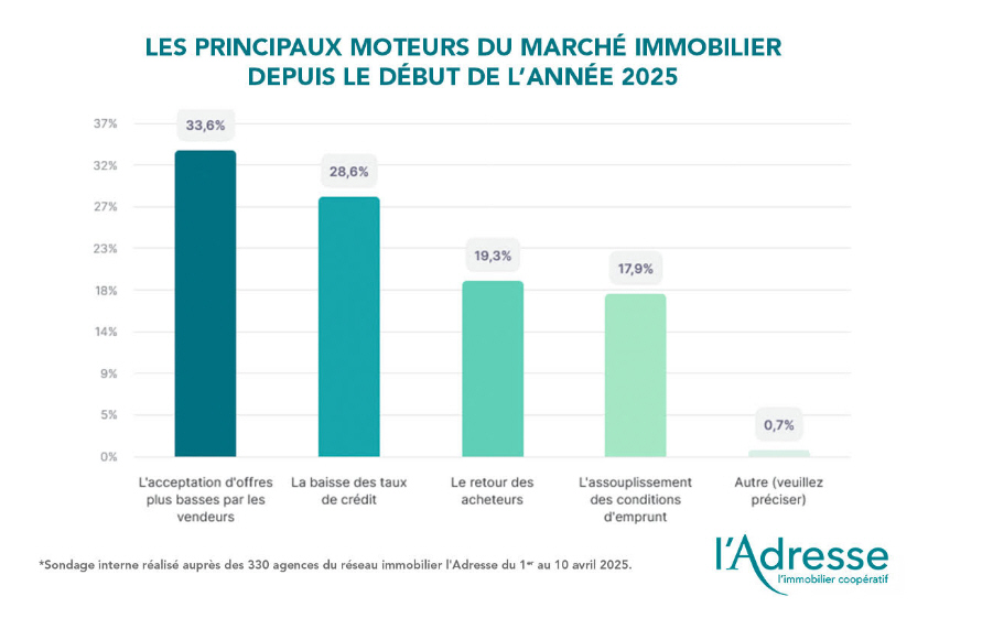 Afin de dresser un bilan du premier trimestre et de prendre la température pour le reste de l’année 2025, le réseau l’Adresse a réalisé un sondage interne auprès de ses 330 agences immobilières. Sans surprise, la reprise est bel et bien là, mais selon certaines agences, encore en dent de scie. Pour autant toutes constatent le retour de tous les types d’acheteurs et un marché plus fluide, et dans certaines, davantage de biens vendus sans négociation. Pour le reste de l’année 2025, les agences s’attendent en majorité à un marché plus dynamique qu’en 2025… à condition que les taux de crédit restent attractifs et que le contexte économique ne se dégrade pas.