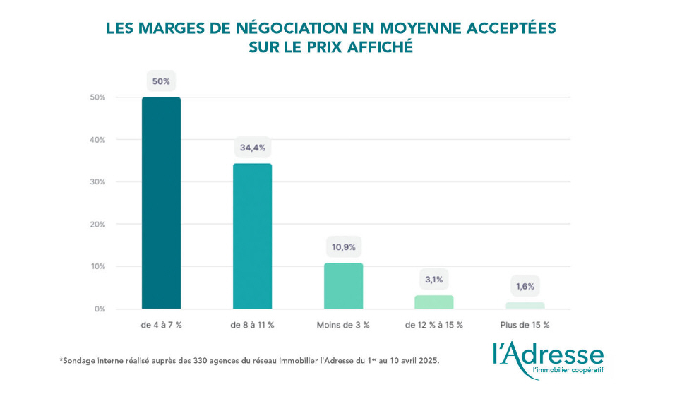 Alors que certains réseaux évoquent actuellement des hausses de prix, moins de 5 % des agences du réseau l’Adresse constatent des augmentations par rapport au dernier trimestre 2024, celles-ci étant essentiellement situées dans les zones littorales ou dans des zones où le marché est particulièrement dynamique, avec une offre limitée de biens. Toutefois si 95 % des agences n’observent pas de hausses des prix, la plupart constatent que les baisses de prix sont moins nombreuses. En effet, 30 % des agences vendent désormais des biens sans marge de négociation, contre seulement 5 % au T4 2024. « Davantage de biens se vendent donc au prix affiché : cela témoigne à la fois de la prise en compte des vendeurs des estimations faites par les professionnels et de leur écoute sur le prix de vente conseillé, mais aussi du fait que l’on arrive enfin à un alignement entre ambitions des vendeurs et capacité d’achat des acheteurs ! » analyse Brice Cardi
