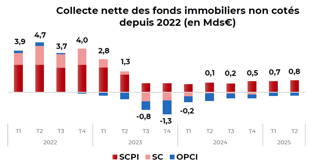Au premier semestre 2025, la collecte nette des SCPI atteint 2,2 milliards €, un montant en progression de 29 % par rapport au premier semestre 2024. Au deuxième trimestre 2025, la collecte nette s’établit à 1,1 milliard €, en hausse de 6 % par rapport au premier trimestre 2025 et de 23 % par rapport au deuxième trimestre 2024.