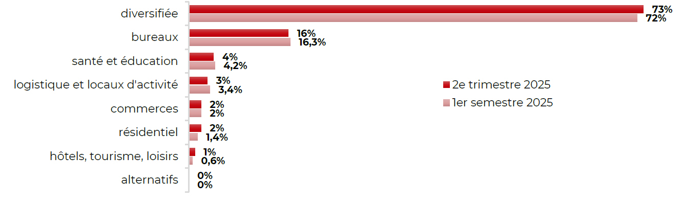 La dynamique de collecte brute au premier semestre est nettement concentrée sur les SCPI à stratégie « diversifiée » (72 %), suivies par les SCPI à prépondérance « bureaux » (16,3 %), puis « santé et éducation » (4,2 %), « logistique et locaux d’activité » (3,4 %), « commerces » (2 %), « résidentiel » (1,4 %) et « hôtels, tourisme et loisirs » (0,6 %).