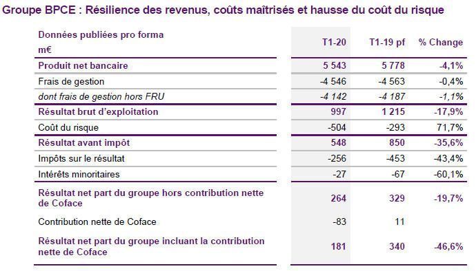 Sans surprise, comme les autres groupes bancaires, BPCE enregistre une forte progression du coût du risque (+77%). La moins-value liée à la cession de la Coface vient plomber davantage les comptes au premier trimestre 2020.