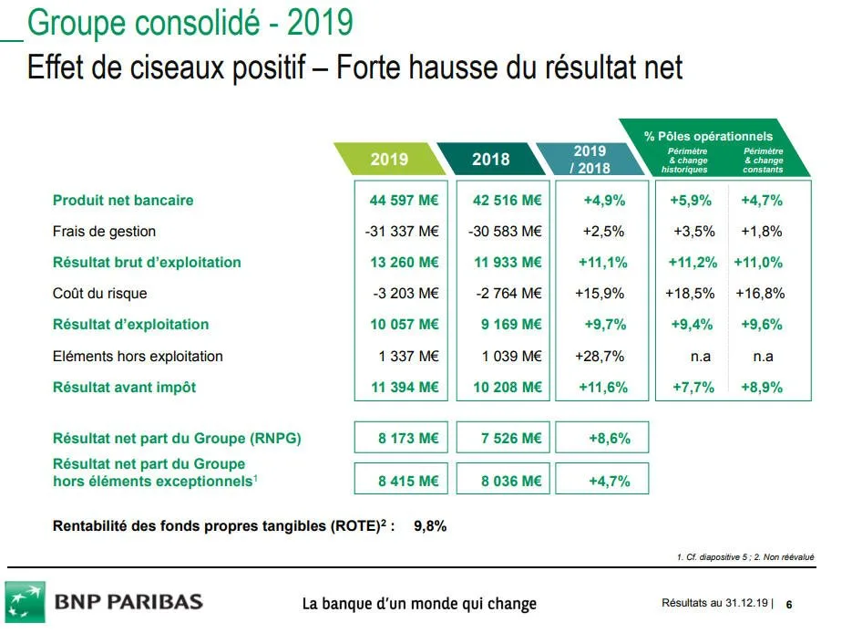 La bonne maîtrise des coûts permet de dégager un effet de ciseaux positif de 2,4 points. Cet effet de ciseaux s’accompagne d’une baisse du coefficient d’exploitation dans chacun des pôles opérationnels grâce à la mise en œuvre, en ligne avec le plan 2020, des mesures de réduction de coûts pour un total cumulé de 1,8 milliard d’euros depuis le lancement début 2017. Les coûts de transformation sont en ligne avec les objectifs annoncés et il n’y en aura plus en 2020.